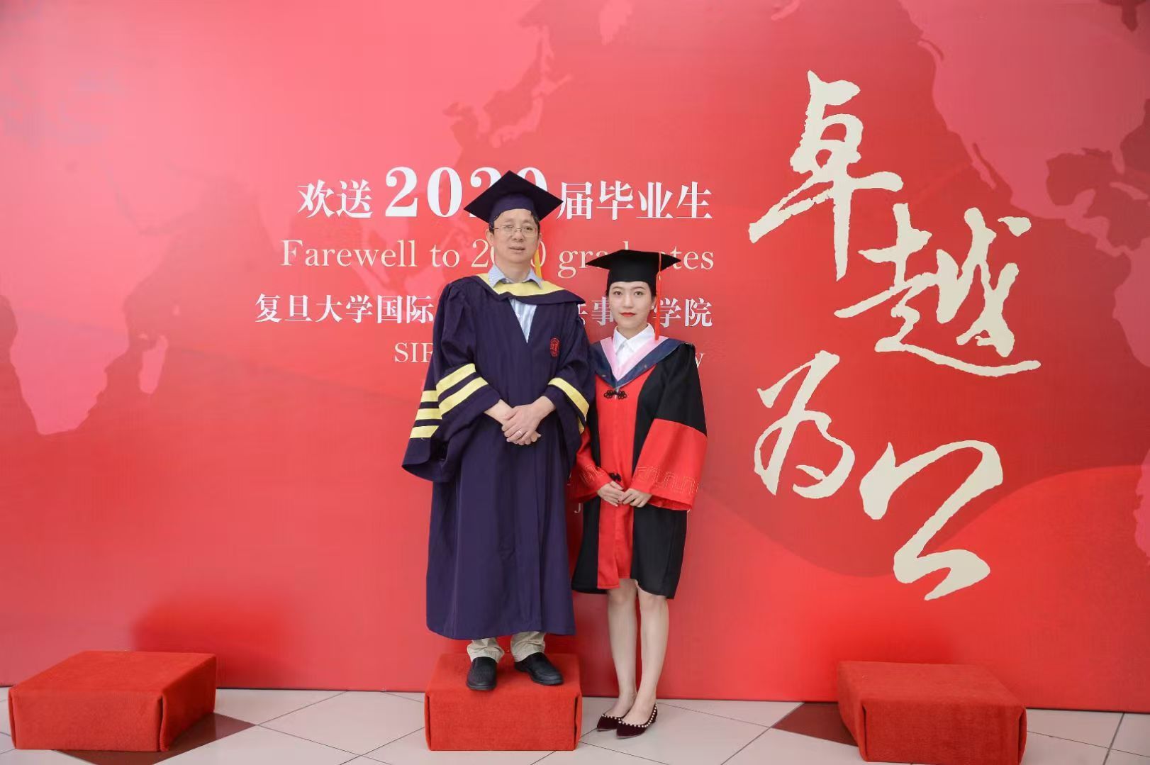 2020年8月罗艳琦在复旦大学国际关系与公共事务学院获得国际政治专业博士学位,与导师吴心伯合影