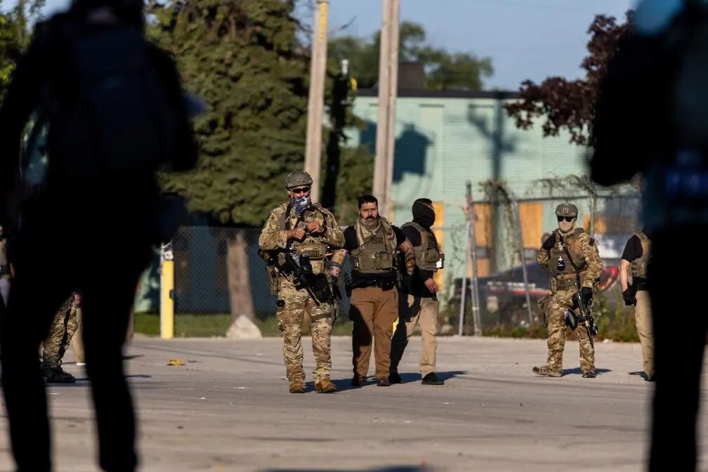 ▲9月26日,在位于美国芝加哥西郊布罗德维尤市的移民与海关执法局办事机构,执法人员在路障内与抗议者对峙。