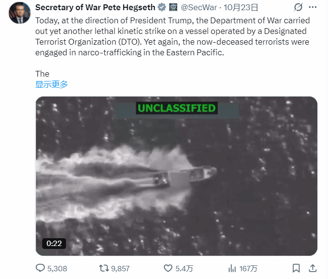 ▲美国防长赫格塞思23日宣布,美军当天又在太平洋东部水域击沉一艘“运毒船”,船上3人全部死亡。同日,飞行追踪数据显示,至少有一架美国B-1B轰炸机靠近委内瑞拉沿岸。
