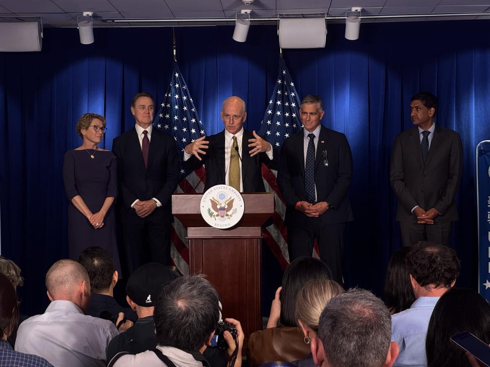 9月23日,美国国会众议员代表团在北京美国驻华大使馆召开记者会。中间为亚当·史密斯,左二为美国驻华大使庞德伟(David Perdue)。澎湃新闻记者 史含伟 摄