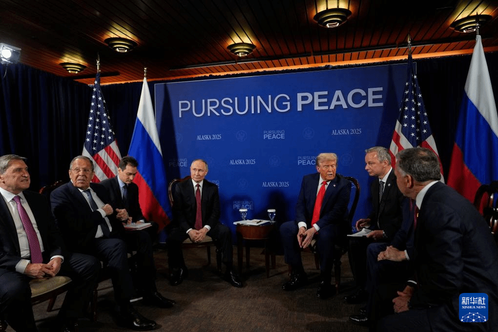 当地时间2025年8月15日11时20分许,美国总统特朗普(右三)和俄罗斯总统普京(左四)在美国阿拉斯加州安克雷奇举行会晤。新华社/美联