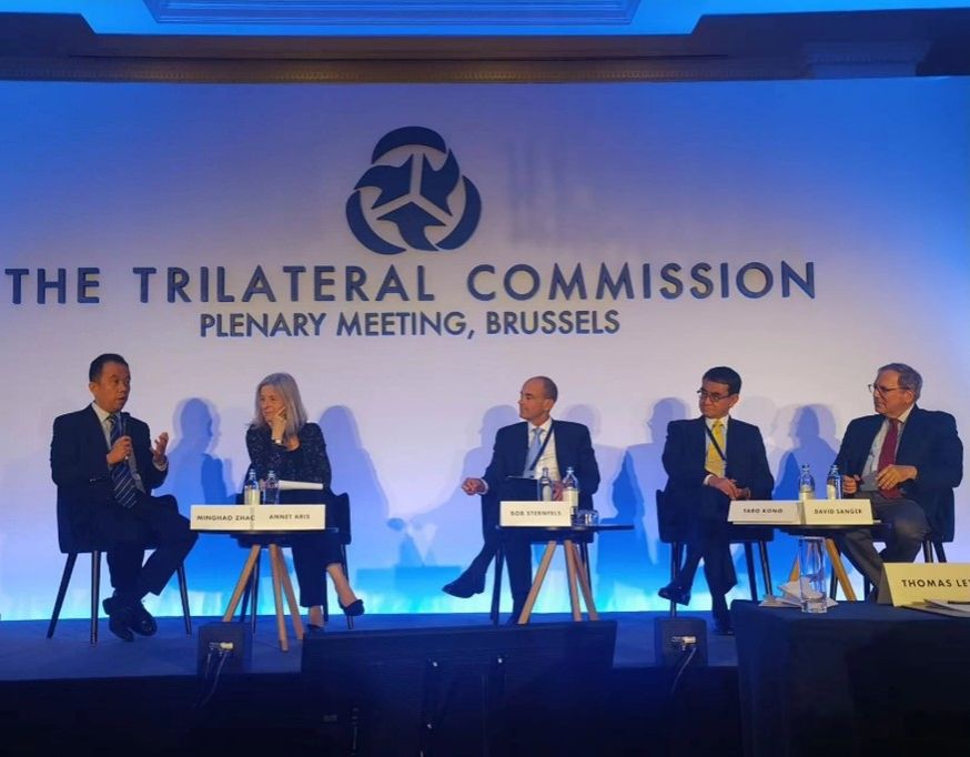 与日本数字转型担当大臣、前外务大臣和防务大臣河野太郎,荷兰阿斯麦公司董事阿瑞斯Annet Aris,麦肯锡公司全球管理合伙人Bob Sternfels,纽约时报白宫和国家安全事务首席记者David Sanger讨论中美科技竞争